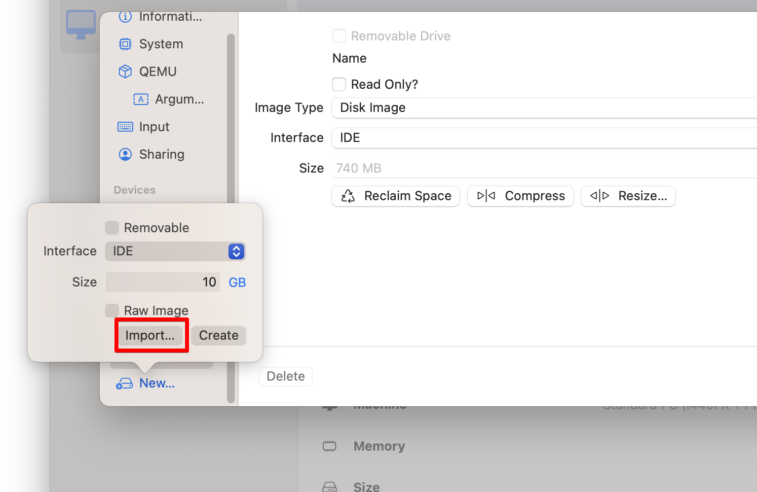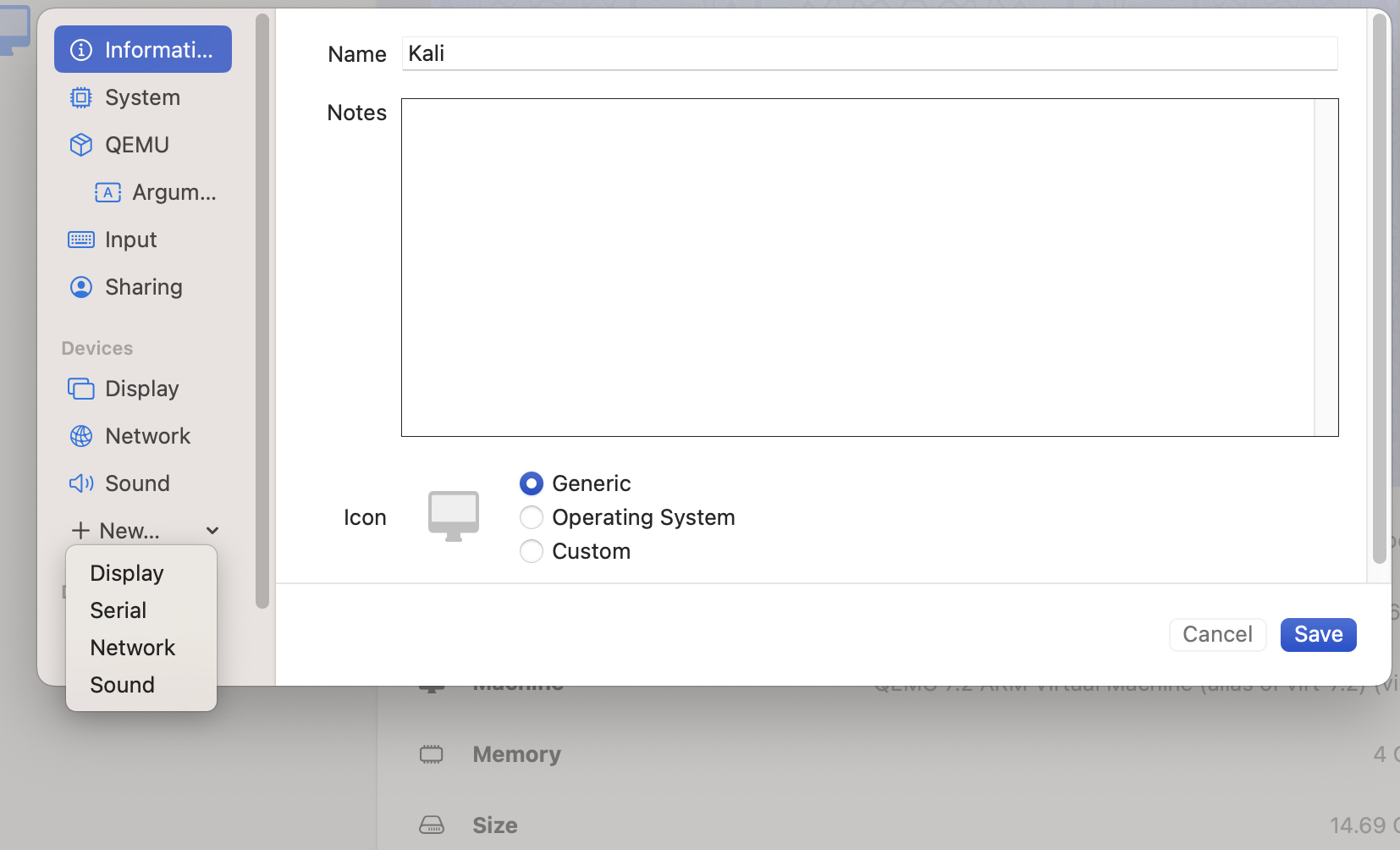 The output file can then be used to initialize the VM. We then create a new VM in UTM. Since Kioptrix is a rather old image, it uses i386 as its architecture, and therefore the emulation option must be selected. It is also necessary to select the option to avoid the ISO boot