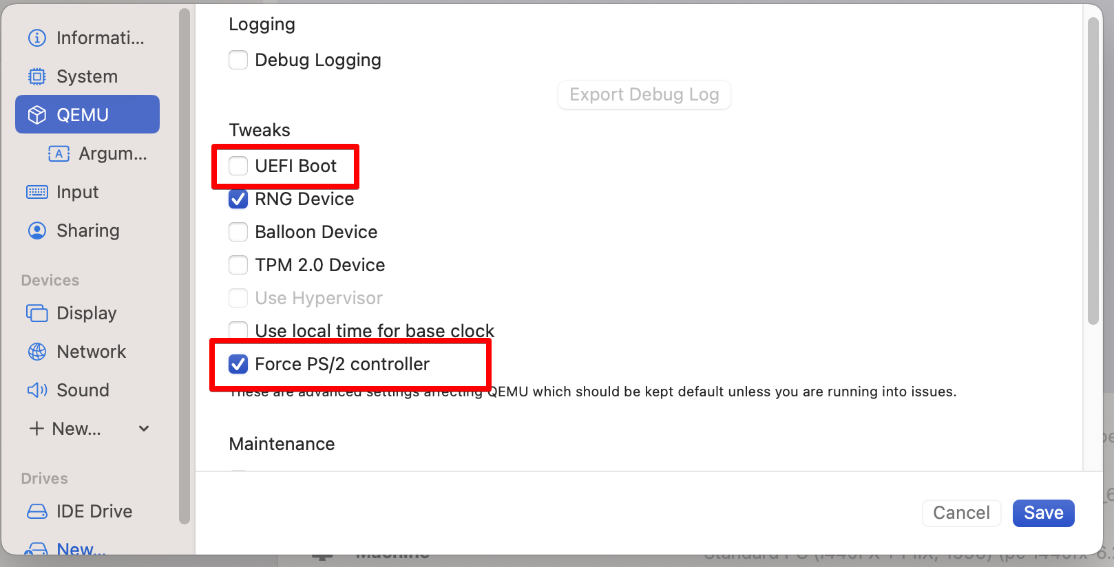 At this point we can confirm the creation of the VM. In the settings, we must also select not to enable UEFI boot and force the use of the PS2 controller
